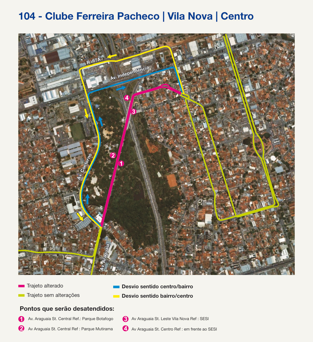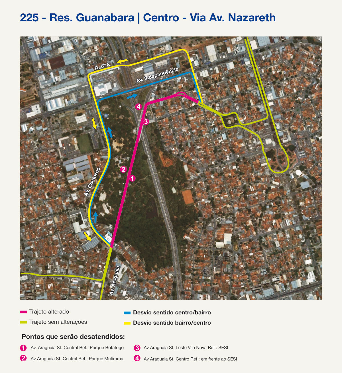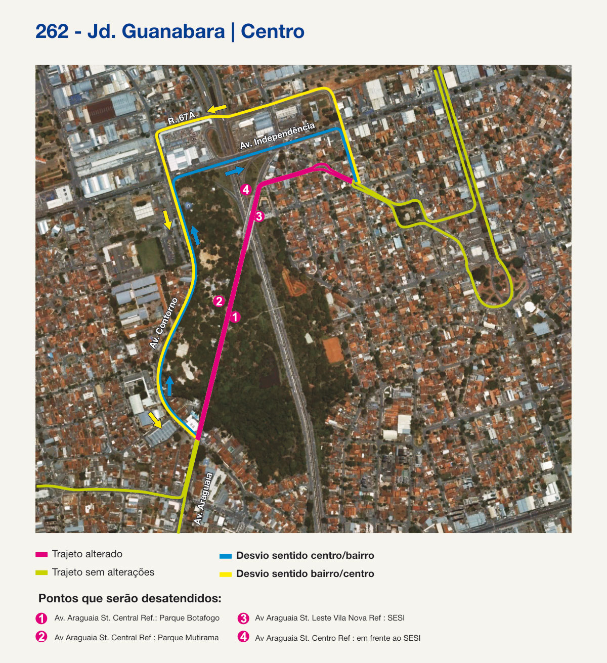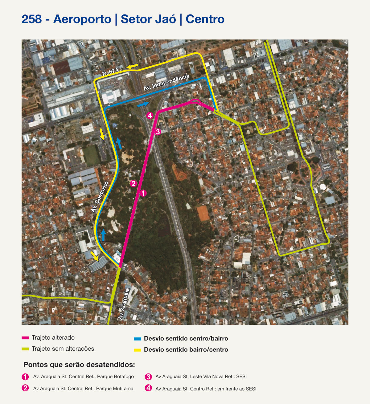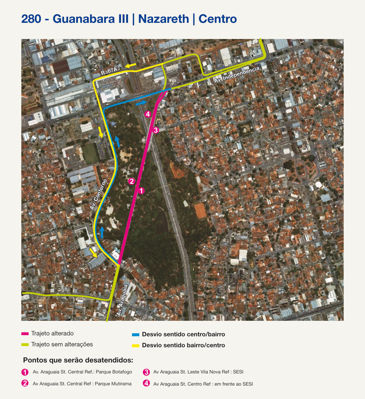 As linhas 104 (Clube Ferreira Pacheco/Centro); 225 (Res. Guanabara/Centro-via Av. Nazareth); 258 (Circular Aeroporto/Centro-via St. Jaó); 262 (Jd. Guanabara/Centro), 268 (Campus/ Crimeia Leste/ Centro e Campus/ Goiânia 2/ Centro) e a 280 (Jd. Guanabara III/Centro- via Av. Nazareth) deixarão de passar pela Avenida Araguaia a partir de amanhã, terça-feira, 31. A medida será implementada enquanto durarem as obras para construção do novo complexo do Parque Mutirama – parte da obra está prevista para ser entregue ao final deste ano.