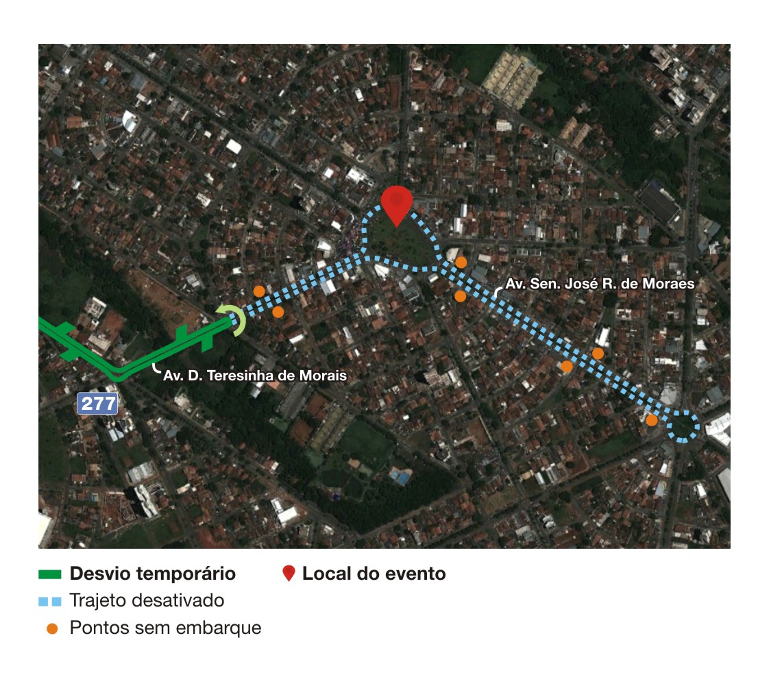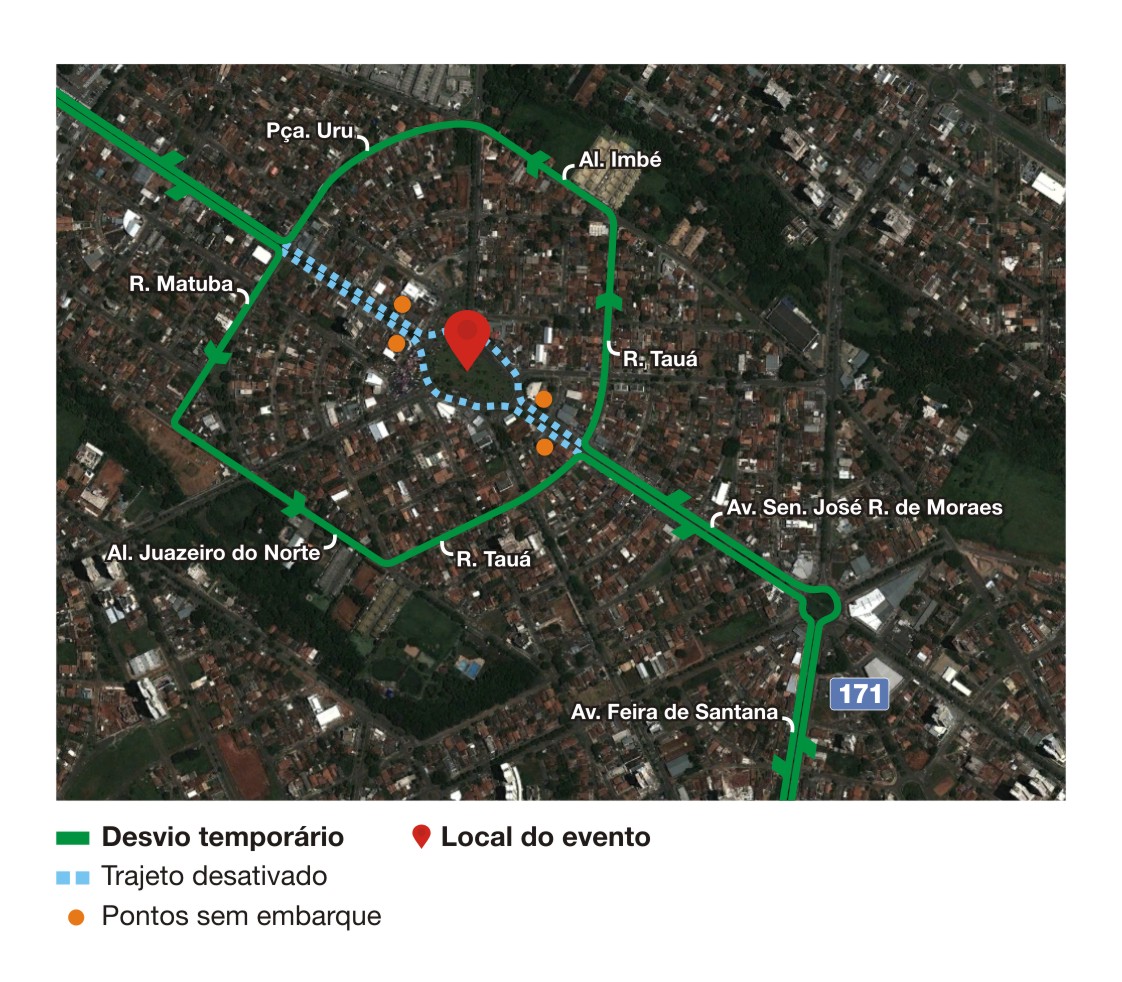 No dia 1º de maio, a Praça Senador José Rodrigues de Morais Neto, conhecida como Praça da Feira, será interditada para a realização de evento em comemoração ao Dia do Trabalho. Com a interdição os clientes das linhas 016, 017, 019, 171 e 277 deverão ficar atentos aos desvios que serão realizados durante o evento. Os pontos 1533, 1534, 1539, 1540, 1788, 1789, 1790, 1816, 1821, 1825, 1826, 1848, 1853 e 5801 ficarão sem atendimento.